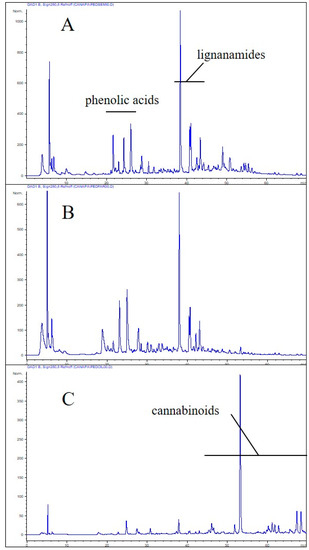 Reversed phase-high performance liquid chromatography (RP-HPLC) chromatograms of hydroalcoholic extracts from seeds (A), flour (B) and oil (C) of hemp Fedora cv. The seed and flour extracts share a very similar chromatographic pattern, dominated by lignanamides [27]. As expected, the oil extracts exhibited a different chromatogram, which most likely included simple phenolics and cannabinoid derivatives [28].