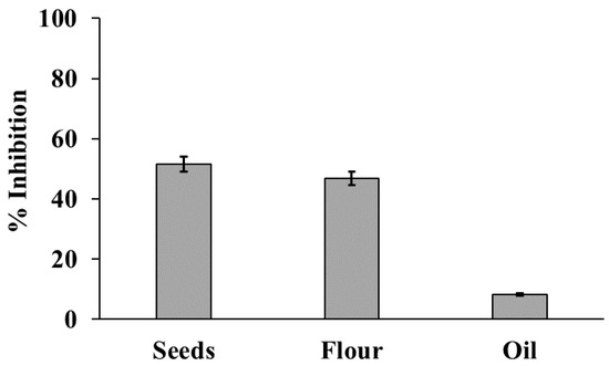 Antioxidant capacity (DPPH test) of seeds, flour, and oil hemp extracts (0.2 g mL−1). The results are expressed as inhibition %. Trolox® was used as a positive control for DPPH inhibition (see text). Data are means ± SD of three independent determinations.