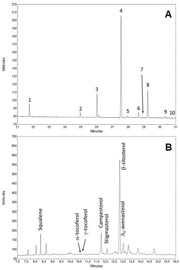 An exemplificative GC/FID chromatogram of the unsaponificable fraction of hemp oil is shown in Figure 3B, along with the assignment of the main components relying on the comparison of retention times by with pure standards.