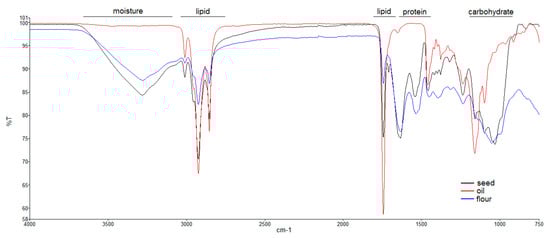 Carbohydrates possess strong and characteristic IR absorptions between 1200 and 750 cm−1 (fingerprint region) relevant to coupling and combination of stretching/deformation or vibrational modes of individual bonds in the molecular skeleton. Both seeds and flour had intense IR bands assigned to carbohydrates, although the profile in the fingerprint region was significantly different between the two samples. As expected, these bands were missing in the oil. However, such a preliminary suggestion requires opportune validation through dedicate investigations.