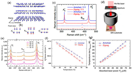 - Ribeiro, H.B.; Pimenta, M.A.; de Matos, C.J.S. Raman spectroscopy in black phosphorus. J. Raman Spectrosc. 2018, 49, 76–90. [Google Scholar] [CrossRef]