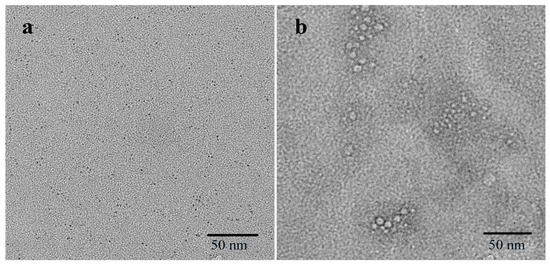 Transmission electron microscopy (TEM) images of the bovine-serum-albumin-stabilized Cu nanoclusters (BSA-Cu NCs) in the absence (a) and presence of 100 μM gossypol (b).