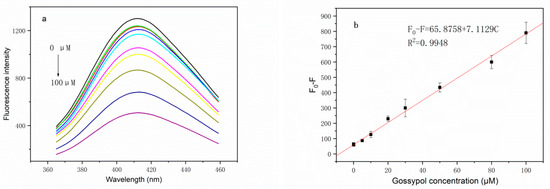 Figure 1a shows typical transmission electron microscopy (TEM) images of the as-synthesized BSA-Cu NCs, which appear as spherical monodisperse clusters with sizes of approximately 2 nm. The TEM images reveal that aggregation of the Cu NCs occurred following the addition of gossypol (Figure 1b). The optical properties of an aqueous solution of the BSA-Cu NCs were investigated by UV-visible and fluorescence spectroscopies. When considering the UV-vis absorption spectrum (Figure 2a), the Cu NCs are clearly relatively small, which is consistent with the TEM results. Upon excitation at 320 nm, the BSA-Cu NCs showed an emission band centered at 400 nm (Figure 2b). The character of the spectrum was consistent with that reported in the literature [27,28], which suggests the successful preparation of BSA-Cu NCs. The fluorescence response of the BSA-Cu NCs to gossypol is shown in Figure 3a. The emission intensity of the BSA-Cu NCs decreased by 66% after the addition of 100 µM of gossypol, indicating that the BSA-Cu NCs could potentially be used as a fluorescent probe for the detection of gossypol.