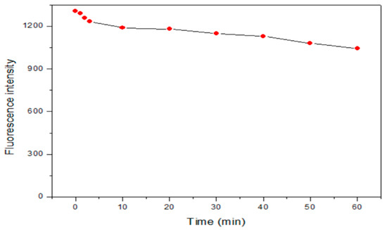 To explore the photostability of the obtained BSA-Cu NCs, the BSA-Cu NCs were exposed to UV irradiation with a wavelength of 365 nm for 60 min. Most organic dyes will suffer from light degradation over this length of time. As shown in Figure 4, a decrease in fluorescence of only 20% demonstrated that the BSA-Cu NCs possess great photostability, which makes them a promising candidate for continuous tracking studies over a long period of time. The slight fluorescence quenching of the Cu NCs can be attributed to conformational changes in the BSA on the surface of the NCs, which may lead to agglomeration or the disintegration of nanoparticles. A similar case has been reported by Georgina’s group [29].