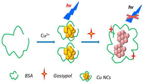 Fluorescence methods have proven to be powerful optical techniques for the detection of trace analytes. To date, few reports have been published regarding the fluorescence detection of gossypol [12,13]. Furthermore, for the type of method described in these reports, complex chemical modification or strict reaction conditions are needed. Recently, metal nanoclusters (NCs) consisting of several atoms have sparked considerable interest as novel fluorescent markers owing to their ultra-small size, biocompatibility, and water solubility [14,15,16]. Among these metal NCs, protein-protected Au and Ag NCs are currently the most intensively explored [17,18,19,20,21,22]. However, because the cost of gold and silver precursors is very high, the exploration of new, cheap, and biocompatible metal nanoclusters is of great value. Copper NCs fit these characteristics [23]. In addition, the application of protein-coated fluorescent metal NCs in analysis mainly relies on the quenching of NC fluorescence through interactions between the cluster and ions (Hg2+, Cu2+, CN−) [18,21,24] or through oxidation of the Au-S bonds between the cluster and protein by hydrogen peroxide (H2O2) [25]. However, gossypol has been reported to form a stable complex with bovine serum albumin (BSA) which induces concentration-dependent conformational changes in the vicinal groups of the binding sites [13,26]. This phenomenon provides new insight into the direct fluorescence regulation of BSA-stabilized Cu NCs (BSA-Cu NCs) by gossypol, which is valuable for the establishment of new methods.