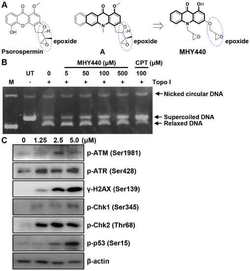 The chemical structure of the novel Topo I inhibitor, MHY440, and the effect of MHY440 on the DNA damage response in AGS cells. (A) The rationale for the design of MHY440 [1-hydroxy-3-((R/S)-oxiran-2-ylmethoxy)-10-((R/S)-oxiran-2-ylmethyl) acridin-9(10H)-one]. (B) Supercoiled substrate pHOT1 DNA (0.25 μg) was incubated with various concentrations of MHY440 (0, 5, 50, 100, and 500 μM) and Topo I at 37 °C for 30 min. The reaction product was separated on a 1% agarose gel containing EtBr. M, relaxed pHOT1 marker DNA; UT, supercoiled substrate pHOT1 DNA; CPT, camptothecin. (C) Western blot analysis of total cell lysates from cells treated with increasing concentrations of MHY440 for 24 h. The blots were probed with p-ATM (Ser1981), p-ATR (Ser428), γ-H2AX (Ser139), p-Chk1 (Ser345), p-Chk2 (Thr68), and p-p53 (Ser15). β-actin was used as a loading control. Representative results from three independent experiments are shown.