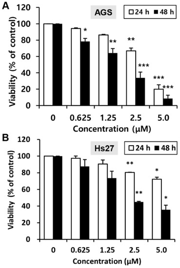 Effect of MHY440 on the viability of AGS human gastric cancer cells and Hs27 human foreskin fibroblast cells. (A) AGS cells were cultured with increasing concentrations of MHY440 for 24 and 48 h. The percentage of cell viability was then determined using the MTT assay. (B) Hs27 cells were treated with MHY440 for 24 and 48 h, and cell viability was determined by MTT assay. The results are expressed as a percentage of vehicle-treated controls ± standard deviation (SD) in three separate experiments. Significance was calculated by the Student’s t-test (* p < 0.05, ** p < 0.01, and *** p < 0.001 compared with vehicle-treated cells).