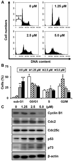 To investigate whether MHY440 affects cell cycle distribution, AGS cells were treated with various concentrations of MHY440 for 24 h and then analyzed for cell cycle progression using flow cytometry. As shown in Figure 4A, MHY440 exposure resulted in an accumulation of cells at G2/M phase. Flow cell analysis demonstrated that 45.58% of cells cultured with 1.25 μM MHY440 were in G2/M phase compared to 28.54% of control cells. In addition, the sub-G1 population increased from 1.88% in the control group to 39.87% in cells treated with 5.0 μM MHY440 (Figure 4B). Next, we examined whether MHY440 regulates the expression of G2/M cell cycle regulators. Cells were treated with various concentrations of MHY440 for 24 h and the level of G2/M cell cycle regulating proteins were examined using western blot analysis. As shown in Figure 4C, MHY440 treatment markedly decreased cyclin B1 in a concentration-dependent manner in AGS cells; Cdc2 and Cdc25c proteins were also slightly decreased. The transcription factor p53 is induced by a number of stress signals. Cell cycle arrest and apoptosis are the most prominent results of p53 activation [20]. In addition, p73 is a protein associated with p53, and it is considered a tumor suppressor because it is structurally similar to p53. It is involved in cell cycle regulation and induction of apoptosis [21]. Therefore, we examined the expression of p53 and p73 in AGS cells treated with MHY440. Our results show that MHY440 treatment increased the expression of both p53 and p73 in a concentration-dependent manner in AGS cells (Figure 4C). In summary, these results indicate that MHY440 induced cell cycle arrest by controlling the expression of key proteins involved in the regulation of G2/M phase in AGS cells.