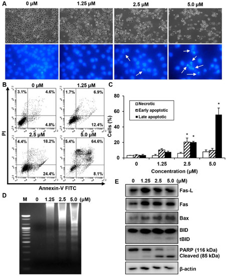 The effect of MHY440 on apoptosis in AGS cells. (A) Morphological changes of MHY440-treated cells. Nuclei of AGS cells stained with Hoechst 33342 to visualize DNA. The stained cells and nuclei were then observed with a fluorescence microscope (original magnification, 400×). Arrows indicate apoptotic cells. (B) The effect of MHY440 on cell death was determined via Annexin V-FITC/PI analysis using flow cytometry. (C) Results are expressed as the means ± SD of three independent experiments. Significance was determined using Student’s t-test (* p < 0.05 compared with vehicle-treated cells). (D) Representative results of DNA analysis from three independent experiments are shown. M, Marker. (E) Western blot analysis of total cell lysates of cells treated with increasing concentrations of MHY440 for 24 h. The blots were probed with antibodies against Fas-L, Fas, Bax, BID, and PARP. β-actin was used as a loading control. Representative results from three independent experiments are shown.