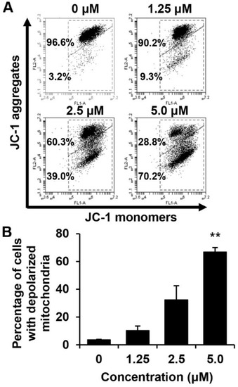 The effect of MHY440 on the mitochondrial membrane potential (ΔΨm) in AGS cells. (A) To analyze ΔΨm, AGS cells were incubated with the indicated concentrations of MHY440 for 24 h, stained with JC-1 dye, and analyzed using flow cytometry. The data shown represent three independent experiments with similar results. (B) Quantitative data are provided by means of green fluorescence (depolarized ΔΨm) in the monomeric form of JC-1. The results are expressed as means ± SD of three individual experiments. Significance was determined using Student’s t-test (** p < 0.01 compared with vehicle-treated cells).
