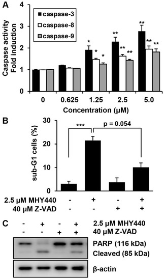 Pro-caspases are precursors of caspases, which are the executors of the apoptotic process [22]. However, a decrease in the level of a pro-caspase may not accurately reflect the activation of caspase. We, therefore, evaluated the effect of MHY440 on caspase activation using specific substrates. The histograms in Figure 7A show that caspase-3 activation was increased almost three-fold in AGS cells treated with 5.0 μM MHY440, while caspase-8 and caspase-9 did not increase more than two-fold (Figure 7A). To identify the relevance of caspase activation in MHY440-induced apoptosis, AGS cells were cultured in the presence and absence of the broad-spectrum caspase inhibitor Z-VAD-FMK and analyzed using flow cytometry and western blot analysis. As shown in Figure 7B, pretreatment of cells with Z-VAD-FMK partially decreased the accumulation of sub-G1 fractions induced by MHY440. To further demonstrate this result, western blot analysis for PARP cleavage was conducted using the same experimental conditions. Consistent with the cell death measured by flow cytometry, western blot analysis of PARP showed that pretreatment with Z-VAD-FMK significantly inhibited the cleavage of MHY440-induced PARP (Figure 7C). These results suggest that activation of caspases contributed to the MHY440-induced apoptosis in AGS cells.