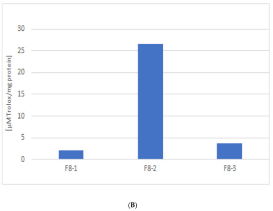 (A) The reversed-phase HPLC pattern of the F8 fraction obtained by gel filtration and (B) the FRAP activity of the eluted peaks expressed in μM Trolox/mg protein.