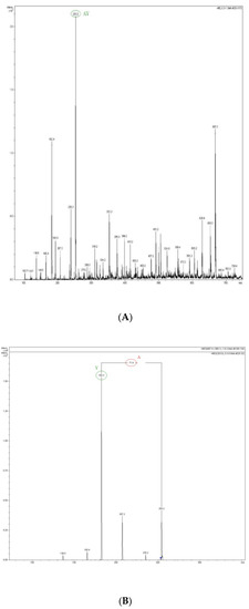 The MS (A) and MS/MS spectrum (B) of the peptide from fraction F8-2.