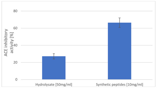 The ACE-inhibitory activity was measured by a spectrophotometric assay of Nasri et al. (2013) [42] with some modifications. In brief, 80 μL of a synthetic peptide (10 mg/mL) or hydrolysate (50 mg/mL) solution was added to 200 μL of 5 mM hippuryl-l-histidyl-l-leucine (HHL), and then preincubated for 3 min at 37 °C. The peptide and HHL were dissolved in 100 mM borate buffer (pH 8.3) containing 300 mM NaCl. The reactions were then initiated by adding 20 μL of 0.1 U/mL ACE from rabbit lungs (Sigma-Aldrich, Poznan, Poland), prepared in the same buffer. After incubation at 37 °C for 30 min, the enzymatic reactions were stopped by addition of 250 μL of 0.05 M HCl. The released hippuric acid (HA) was extracted with ethyl acetate (1.7 mL). The upper layer of the solution was evaporated at 95 °C under a constant flow of nitrogen. The residue was dissolved in 1 mL of distilled water, and the absorbance of the extract at 228 nm was determined on a spectrophotometer (UV/VIS, HeliosWaltham, MA, USA). The ACE-inhibitory activity was calculated using the equation: