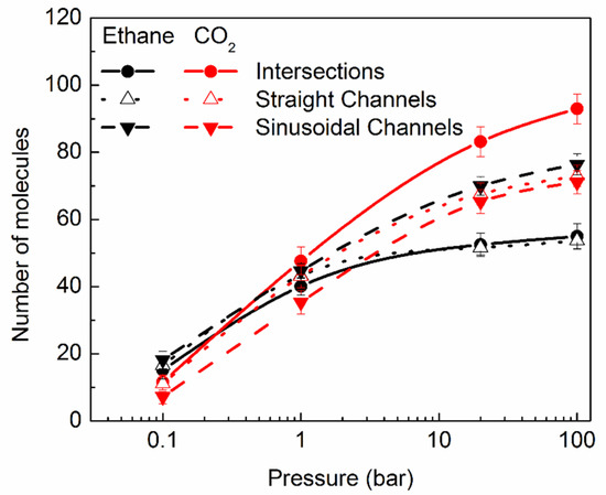 Both ethane and CO2 exhibit type I isotherms up to 100 bar. It is interesting to note that all three types of pores in silicalite intersections, straight channels, and sinusoidal channels are accessible to both ethane, as well as CO2 at all pressures, as shown in Figure 2. Even at lower pressures not investigated with MD, GCMC data show that the molecules start to populate all three types of pores (see Supplementary Materials, Figure S2). This is in contrast to the case of branched alkanes, e.g., iso-butane, that populate only the intersections at lower pressures, resulting in a type IV isotherm, as observed by Vlugt et al. [36]. This is because of the relatively smaller kinetic diameter of ethane and CO2, compared to iso-butane. It is natural that CO2 shows a clear preference for intersections at higher pressure. This is because the intersections offer a marginally larger ellipsoidal free space, compared to the straight and sinusoidal channels. However, ethane molecules at higher pressures prefer to stay in sinusoidal channels, although at lower pressures, this preference is not very clear. We note that in our previous study of ethane in silicalite, the highest loading investigated (eight molecules per unit cell) corresponded to a pressure of slightly less than 1 bar. At that pressure, the error bars in Figure 2 make no conclusion about the preference for pore type difficult.