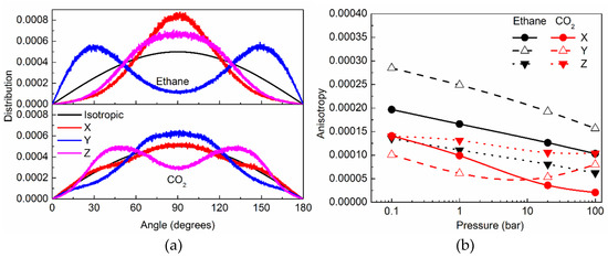 In a matrix like silicalite, that puts severe geometrical constraints on the sorbed molecules, both positional as well orientational ordering of molecules can be expected. Indeed, orientational ordering has been observed for several molecules that have been sorbed in silicalite [6,15,27]. Orientational ordering is observed overall for both ethane and CO2 in silicalite (See Supplementary Materials, Figure S1). Due to the tortuous shape of the sinusoidal channels a wide distribution of orientations can be expected for confined molecules. Likewise, at channel intersections, the geometrical restriction is slightly relaxed, due to a larger pore volume and ellipsoidal shape; thus, orientational ordering of sorbed molecules is expected to be less constrained, resulting in relatively more disorder. In straight channels that are parallel to the Cartesian Y axis, the ordering is relatively stronger, and the distribution is easier to interpret. Therefore, in Figure 3a, we show the orientational distribution function (ODF) of ethane and CO2 at 100 bar in the straight channels of silicalite, with respect to the three Cartesian directions. In absence of a preferred orientation, the distribution is expected to be isotropic, and the corresponding ODF is also included in Figure 3a for comparison. Any deviation from the isotropic ODF signifies a preferred orientation. Clearly, both ethane and CO2 show deviations from isotropic behavior. However, the preferred directions in the two cases are different. While ethane prefers to lie mostly along the channel axis (with the Y-direction showing stronger than isotropic distribution at lower (closer to 0°) and higher (closer to 180°) angles), CO2 prefers to lie perpendicular to the channel axis (with the Y-direction ODF peaking at 90°, and being weaker at lower and higher angles, compared to isotropic ODF).