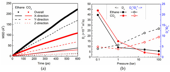 where nd is the number of degrees of freedom, and t is time. For consistency, we used the slope of MSD vs. t curve between t = 400 ps and t = 600 ps, to obtain the self-diffusion coefficient in all cases. In Figure 4b, we show the self-diffusion coefficient of ethane and CO2 (solid black and red symbols respectively) as a function of pressure. The variation of Ds with pressure is similar for both ethane and CO2. Ds decreases at higher pressure, as can be expected, due to the crowding of molecules at higher pressures. At lower pressures, ethane exhibits slower diffusion compared to CO2, whereas at higher pressures, ethane becomes relatively faster. This could be because of the relatively lower amounts of ethane sorbed in silicalite at higher pressures. In Figure 4b, we also show the ratio of self-diffusivity in the directions Y and Z (DsY/DsZ; open symbols) as a function of pressure. This ratio is a measure of the anisotropy in the translational diffusion. The anisotropy in translational diffusion is found to increase at higher pressures for both ethane and CO2. Further, the anisotropy at higher pressures is greater for ethane, compared to CO2. This could be a consequence of the slightly larger kinetic diameter of ethane, which makes it more difficult for ethane molecules to diffuse through sinusoidal channels (X–Z plane), compared to the straight channels.