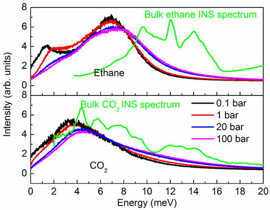 Vibrational spectra of ethane (top) and CO2 (bottom) in silicalite at different pressures. Also included in green are the spectra of bulk ethane [30] and CO2 [31], obtained in inelastic neutron scattering experiments and available at the ISIS INS database [32].