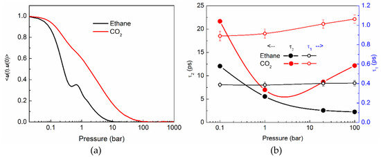 In Figure 6a we show the RCF of ethane (black curve) and CO2 (red curve) at 100 bar. Compared to ethane, the RCF of CO2 takes longer to decay to zero, indicating a slower rotational motion of CO2 compared to ethane. Further, the RCF of both ethane and CO2 exhibit distinct behaviors at times that are shorter than a picosecond, and longer times. This facilitates dividing the RCF in two regimes of sub-picosecond times, and longer times. The boundary of these two regimes is marked clearly in case of ethane in the form of a kink. As mentioned in previous publications, this is a signature of vibrational motion [15,27]. No kink can be observed in the case of CO2 suggesting that the rotational motion of CO2 is different from the libration type of motion exhibited by ethane and other molecules [6,15,27]. CO2 has a kinetic diameter that is considerably smaller than the channel diameter of silicalite. Further, the interaction of the molecule with the pore walls is not strong enough to restrict it from rotating more freely inside the silicalite channels, tracing out the entire orientational space available.