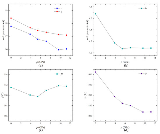 At low pressures, b is by far the most compressible cell parameter: at 5.4 GPa, the length of b is just 0.87 times its ambient pressure value, whilst a and c are 0.94 and 0.95 times their ambient values, respectively (see Appendix A Figure A1). This is perhaps to be expected, owing to the anisotropy of the crystal lattice, and the softness of π-π interactions. The monoclinic angle, β, decreases from 111.51(2)° at 0.1 MPa to 109.77(4)° at 5.4 GPa, before increasing again to 111.82(7)° at 9.6 GPa (Figure 3c). Overall, the change in unit cell volume, V, is a fairly smooth decrease from 1424(4) Å at 0.1 MPa to 1039(3) Å3 at 9.6 GPa (Figure 3d).