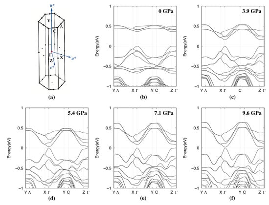 High pressure electronic band structures calculated with the GGA-PBE functional, based on the experimentally-determined structures of [Ni(dddt)2]: (a) Brillouin zone and the reciprocal lattice vectors of the structure in P21/a, (b) ambient pressure, (c) 3.9 GPa, (d) 5.4 GPa, (e) 7.1 GPa, and (f) 9.6 GPa. The dotted line at Energy = 0 eV represents the top of the valence bands.