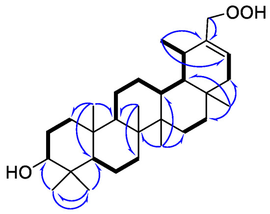 Five structural fragments were established by the correlations observed in the 1H-1H COSY spectrum, as drawn with bold lines in Figure 2 (C-1 to C-3; C-9 through C-11 to C-13; C-13 through C-18 to C-29; C-5 to C-7; C-15 to C-16; and C-21 to C-22). The connectivity study of the quaternary carbons, the other functional groups and the above five structural fragments was mainly achieved by the analysis of the HMBC spectrum (Figure 2). HMBC correlations from 3H-23 (δH 1.25) to C-5, C-3 and C-24, and from 3H-24 (δH 1.06) to C-4, C-3, C-5, and C-23 indicated that Me-23 and Me-24 were attached to C-4. The HMBC correlations of 3H-25 (δH 0.91) to C-5, C-1, C-10, and C-9; 3H-26 (δH 1.00) to C-9, C-7, and C-8; 3H-27 (δH 0.97) to C-13, C-15, and C-8; 3H-28 (δH 0.96) to C-16, C18, and C-22; and 2H-30 (δH 4.66 and 4.91) to C-19, C-20, and C-21 not only confirmed the presence of A/B/C/D/E-ring systems but also located the Me-25, Me-26, Me-27, Me-28, and -CH2OOH-30 at C-10, C-8, C-14, C-17, and C-20 respectively. The structure of 1 was, therefore, determined as 3β-hydroxy-30-hydroperoxy-20-taraxastene.