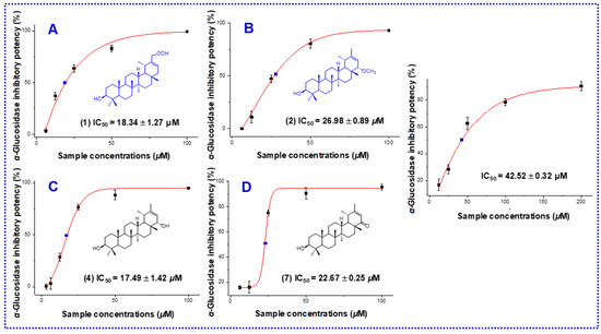 The α-glucosidase inhibitory assay was carried out spectrophotometrically, according to the previously described method, with slight modifications, in which acarbose was used as the positive control [23].