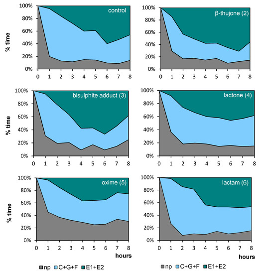 Regardless of the compound that was applied to the aphid host plant, all aphids started probing immediately after being given access to the plants at the beginning of the experiment. In the course of time, the trends in the proportion of time dedicated to individual phases of probing varied among aphids, depending on the compound applied. Generally, non-probing and pathway activities predominated during the initial 1–2 h of the experiment in all aphids on all plants (Figure 2). Later, on control, β-thujone (2), and bisulphite adduct (3)-treated plants, the proportion of non-probing phase decreased while the proportion of non-phloem and phloem probing phases in aphid activities increased, and at the end of the 8-h experiment, phloem phase was the main aphid activity on these plants, ranging from 46% on control to 56% on β-thujone (2)-treated plants. The proportion of phloem phase remained relatively low throughout the 8-h experiment on lactone (4), oxime (5), and lactam (6)-treated plants. The proportion of non-probing activities was relatively high on oxime (5)-treated plants throughout the 8-h experiment, as compared to other treatments (Figure 2).