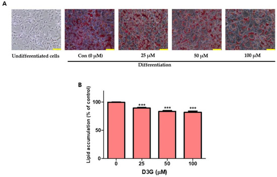 Effect of delphinidin-3-O-β-glucoside (D3G) on lipid accumulation in 3T3-L1 adipocytes. (A) Photomicrographs of lipid droplets in control (Con) and D3G (25, 50, and 100 µM)-treated cells measured by Oil Red O staining. (B) The percentage of lipid accumulation in D3G-treated and control cells. Data represent the mean ± SEM of three different experiments. *** p < 0.001 vs. 0. Scale bar (A) indicates 100 µm.