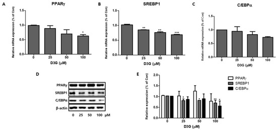 The effect of delphinidin-3-O-β-glucoside (D3G) treatment (25, 50, and 100 µM) on the mRNA expression of key adipogenic transcription factors: (A) peroxisome proliferator-activated receptor gamma (PPARγ), (B) sterol regulatory element-binding transcription factor 1 (SREBP1), and (C) CCAAT/enhancer-binding protein alpha (C/EBPα), as determined by quantitative real-time PCR. (D) Immunoblot analysis of PPARγ, SREBP1, and C/EBPα. (E) Relative protein expression of PPARγ, SREBP1, and C/EBPα in differentiating D3G-treated and control 3T3-L1 adipocytes. β-actin protein levels were used as an internal control. Data represent the mean ± SEM of three different experiments. * p < 0.05, ** p < 0.01, and *** p < 0.001 vs. 0.
