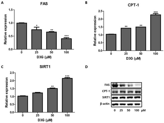 We examined the effects of D3G on lipogenesis and fat oxidation in 3T3-L1 adipocytes. Fatty acid synthase (FAS) expression was significantly downregulated by D3G treatment (Figure 4A,D), while 100 µM D3G significantly upregulated the expression of silent mating type information regulation 2 homolog 1 (SIRT1) and carnitine palmitoyltransferase -1 (CPT-1) (Figure 4B–D).