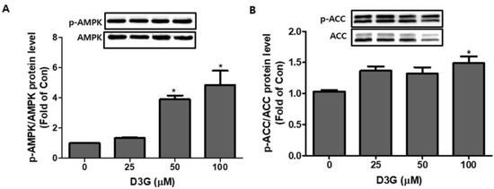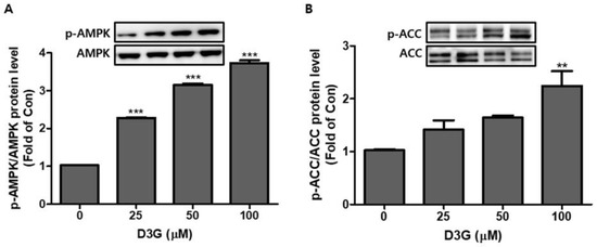 We also investigated the effect of D3G (25, 50, and 100 µM) on PWATs. D3G treatment significantly increased the p-AMPK/AMPK ratio (Figure 6A) and p-ACC/ACC expression (Figure 6B). These results indicate the activation of the AMPK-mediated signaling pathway.