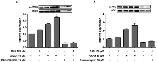 The AMPK pathway plays an essential role in regulating the early phase of adipogenesis. In this study, the expression of AMPK and acetyl-CoA carboxylase (ACC) was analyzed using Western blotting. As shown in Figure 5A,B, D3G significantly upregulated the expression of activated AMPK (p-AMPK/AMPK) and ACC (p-ACC/ACC).