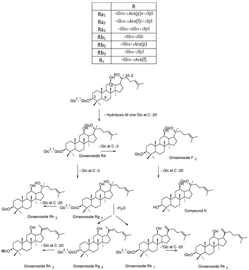 During the steaming process, ginseng secondary metabolites pass through different chemical reactions and transform into other forms. The polar ginsenosides transform into specific less-polar ginsenosides by hydrolysis, dehydration, decarboxylation and isomerization reactions at C-3, C-6 or C-20. The notable structural changes are the hydrolysis of sugar moieties at C-3, C-6 or C-20 and subsequent dehydration at C-20. These reactions took place with the major primary ginsenosides (Rb1, Rb2, Rc, Rd, Re and Rg1) as well as with other minor ginsenosides [28]. As shown in Figure 2, the ginsenosides Ra1, Ra2, Ra3, Rb1, Rb2, Rb3, Rc and Rd are converted to the ginsenosides Rg3, F2, compound K and Rh2 in black ginseng through hydrolysis reactions for sugar moieties at C-3 and C-20. On the other side, the ginsenosides Rk1 and Rg5 are produced as a result of the dehydration reactions of Rg3 [11,18,29]. The R-epimers of Rg2, Rg3 and Rh1 were produced through isomerization of the corresponding ginsenosides as well as through addition reactions (selective attack of the hydroxyl group) for the dehydrated corresponding ginsenosides (Rk1 and Rg5 in case of 20(R)-Rg3) [17,30].