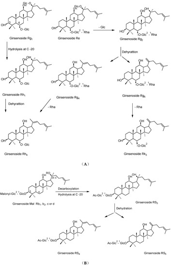 Rh1 and Rh4 were deduced to be generated from the ginsenoside Rg1 through hydrolysis and dehydration reactions (Figure 3A), respectively. Interestingly, four ginsenoside (Rg6, F4, Rk3 and Rh4) were produced from the ginsenoside Rg2 (Figure 3A) through hydrolysis and dehydration reactions [30]. The acetylated ginsenosides (20(S)-Rs3 and 20(R)-Rs3) were produced from the malonyl derivatives of Rb1, Rb2, Rc and Rd the by hydrolysis of glycosyl moiety at C-20 and decarboxylation of malonyl moiety attached to glycosyl linkage at C-3 (Figure 3B), 20(S)-Rs3 further underwent dehydration to generate Rs4 and Rs5 [29]. Generally, the steaming process causes an increase in the protopanaxadiol group to protopanaxatriol group ratio (PD/PT) from 1.9 to 8.4 in white and black ginseng, respectively [18]. In addition, it led to the production of some specific ginsenosides such as (20(S)-, 20(R)-Rg3, Rk3, Rh4, Rk1, Rg5, etc.) which are absent from white ginseng [30,31]. As black ginseng was subjected to much more steaming, the concentration of these ginsenosides is much higher than red ginseng.