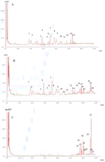HPLC fingerprints of ginsenosides in white P. ginseng (A), red P. ginseng (B) and black P. ginseng (C). Note: 1-Rg1; 2-Re; 4-Rf; 5-(S)-Rg2; 6-(R)-Rg2; 7-Rb1; 8-Rc; 9-Ro; 11-Rb2; 12-Rb3; 13-Rd; 18-(S)-Rg3; 19-(R)-Rg3; 20-(S)-Rs3; 21-(R)-Rs3; 22-Rk1; 23-Rg5; 24-(S)-Rh2; 25-(R)-Rh2.