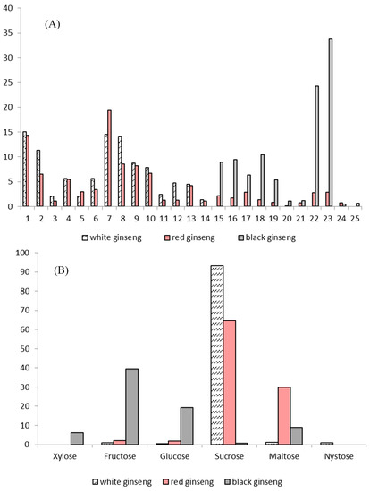 The relative percentage of individual ginsenosides (A) and oligosaccharides (B) in white P. ginseng, red P. ginseng and black P. ginseng. Note: 1-Rg1; 2-Re; 4-Rf; 5-(S)-Rg2; 6-(R)-Rg2; 7-Rb1; 8-Rc; 9-Ro; 11-Rb2; 12-Rb3; 13-Rd; 18-(S)-Rg3; 19-(R)-Rg3; 20-(S)-Rs3; 21-(R)-Rs3; 22-Rk1; 23-Rg5; 24-(S)-Rh2; 25-(R)-Rh2.