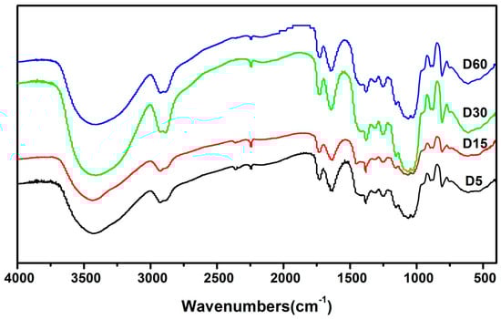 FT-IR spectra of KGM treated with different ultrasonic time (D5, D15, D30 and D60 was assigned to KGM prepared by ultrasonication for 5, 15, 30 and 60 min, respectively).