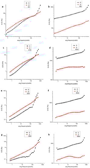 Frequency dependence of G′ and G′′ of KGM sols with different alkali addition before freezing (a,c,e,g) and after freezing (b,d,f,g) dealt.