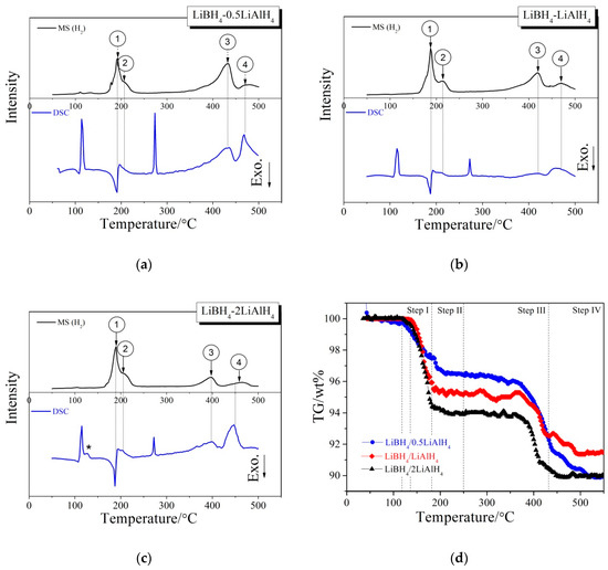 DSC/MS curves of the LiBH4/0.5LiAlH4 (a), LiBH4/LiAlH4 (b), LiBH4/2LiAlH4 (c) and TG curves (d) of the LiBH4/xLiAlH4 (x = 0.5, 1, 2) samples.