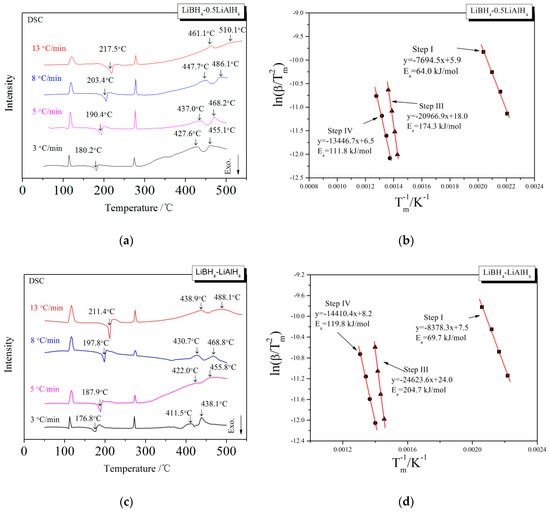 DSC curves (a,c,e) at different heating rates and the Kissinger spectra (b,d,f) that ln(β/Tm2) as a function of Tm−1 for the decomposition steps of the LiBH4/xLiAlH4 (x = 0.5, 1, 2) samples.