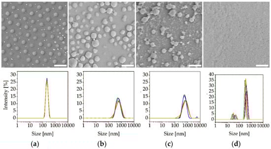 Scanning electron microscopy (SEM) images and dynamic light scattering (DLS) size distribution by intensity (at 50 °C) of different nanogels: (a) monodisperse PNiPAm nanogel particles G-1 synthesized with 0.2 mM SDS; (b) glycogel MG-1 synthesized with 0.4 mM SDS; (c) MG-2 synthesized with 2.0 mM SDS; (d) glycogel MG-3 synthesized with 4.0 mM SDS. Scale bars represent 1 µm.