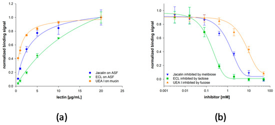 Binding and inhibition of chosen plant lectins to immobilized glycoproteins. (a) The lectins Jacalin and Erythrina cristagalli lectin (ECL) show binding to immobilized asialofetuin (ASF), whereas Ulex europaeus agglutinin I (UEA I) binds to immobilized mucin from porcine stomach. (b) The three lectins bind glycan mediated and are inhibitable by appropriate saccharides. Typical inhibition curves are shown for Jacalin inhibited by melibiose, ECL inhibited by lactose and UEA I inhibited by fucose.