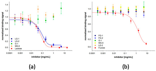 The synthesized lactose nanogels were analyzed in binding assays using ECL, a lactose binding lectin [52]. LG-1 and LG-2 are two lactose-containing NiPAm nanogels of very similar syntheses. Both glycogels show complete inhibition of ECL binding to ASF with identical IC50 values (Figure 5 and Figure 6a). For ECL, no binding enhancement at low glycogel concentrations is visible. Due to the dimeric structure of ECL, crosslinking of the glycogel with the immobilized glycoprotein is less pronounced and not enough to yield an increased fluorescence signal. G-1, a control PNiPAm nanogel without sugar, as well as MG-0, a melibiose containing nanogel, did not inhibit ECL binding proving the binding specificity to lactose. Moreover, free lactose is a potent inhibitor for ECL with IC50 in the same range as the lactose nanogels (Figure 5a). However, due to the limited amount of lactose monomer (approximately 20%) during synthesis, both lactose nanogels contain 0.4 µmol lactose per mg nanogel (Table 5). With IC50 values that are over four-times lower compared to free lactose, when regarding the sugar content (Figure 5b), the lactose nanogel also has a multivalent character and led to good inhibition potency. The multivalent effect of the lactose nanogels, however, is less distinct than that of the melibiose nanogels.
