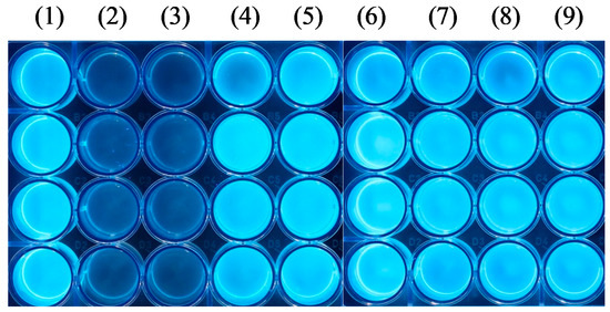 In this first study, we focused on the secretion of the fluorescent siderophore pyoverdin, which is an essential virulence factor of PA [59]. Pyoverdin is involved in various processes, including regulation of other virulence factors as well as the enabling the formation of biofilms, which decreases the sensitivity of PA towards antibiotics [60,61]. Figure 7 shows a fluorescence image of the 24-well plates with PA and gels.
