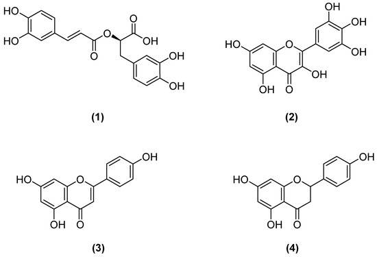 Chemical structures of rosmarinic acid (1), myricetin (2), apigenin (3), and naringenin (4) isolated from Micromeria myrtifolia.