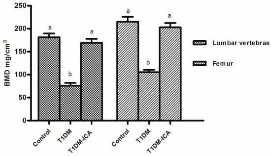 Bone mineral density analysis results showed that the lumbar (L1–L4) and femoral bone mineral density (BMD) were decreased in diabetic rats (p < 0.05), which were recovered by ICA treatment (T1DM-ICA), there was significant difference in BMD between T1DM-ICA group and the T1DM group (p < 0.01) (Figure 2). These results suggest that ICA can increase BMD in diabetic rats.
