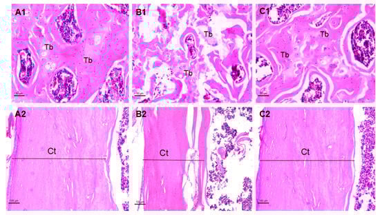 The femoral and tibia morphology of rats in each group. (A1) The femur metaphysis in a rat of control group; (B1) the femur metaphysis in a rat of T1DM (diabetic) group; (C1) the femur metaphysis in a rat of the T1DM-icariin (ICA) group; (A2) the tibia in a rat of control group; (B2) the tibia in a rat of T1DM group; (C2) the tibia in a rat of the T1DM-ICA group. Hematoxylin and eosin staining, magnification: 200× Tb: Trabecular bone. Ct: Cortical bone.
