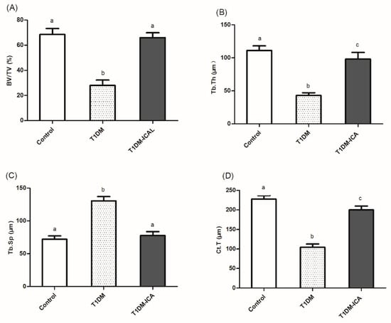 Bone histomorphometric parameters in all experimental groups. (A) Bone volume per tissue volume (BV/TV, %); (B) trabecular thickness (Tb.Th, μm); (C) trabecular separation (Tb.Sp, μm); (D) cortical thickness (Ct.T, μm). Values are presented as means ± SD. Different letters indicate statistically significant difference (p < 0.05).