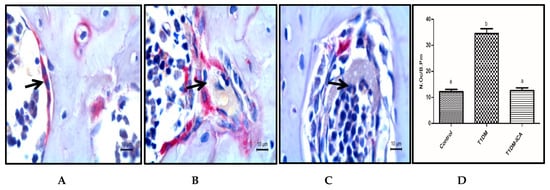 The number of osteoclasts per bone perimeter (N.Oc/B.Pm) in each group. (A) Osteoclasts in femur bone tissue of control group rat; (B) osteoclast in femur bone tissue of T1DM group rat; (C) osteoclast in femur bone tissue of T1DM-ICA group rat; (D) the number of osteoclasts per bone perimeter (N.Oc/B.Pm); Values are presented as means ± SD. Different letters indicate statistically significant difference (p < 0.05). Femur bone tissue slides were stained by tartrate resistant acid phosphatase (TRAP), the black arrow points to osteoclasts.